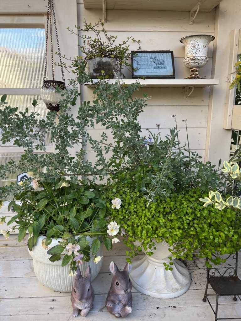 私の大切なパーゴラに置いてあるグリーンの寄せ植えも元気です。